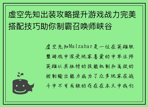 虚空先知出装攻略提升游戏战力完美搭配技巧助你制霸召唤师峡谷