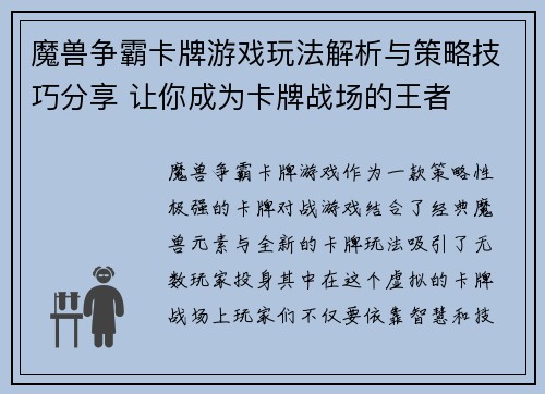 魔兽争霸卡牌游戏玩法解析与策略技巧分享 让你成为卡牌战场的王者