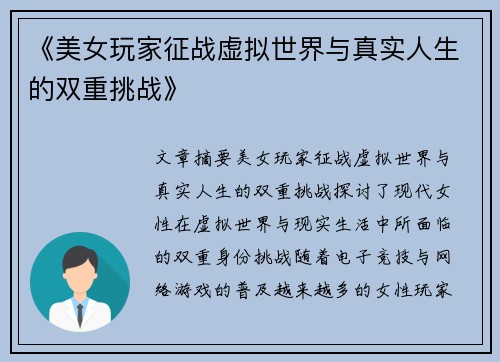 《美女玩家征战虚拟世界与真实人生的双重挑战》