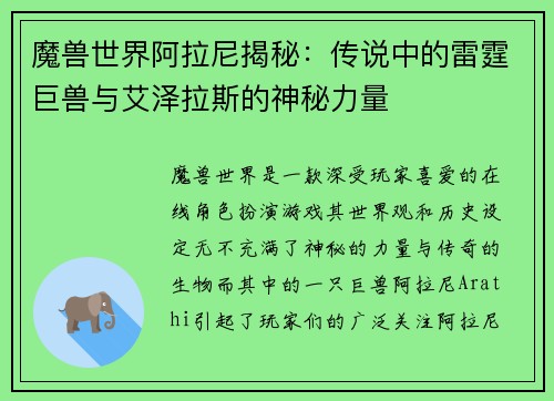 魔兽世界阿拉尼揭秘:传说中的雷霆巨兽与艾泽拉斯的神秘力量
