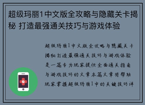 超级玛丽1中文版全攻略与隐藏关卡揭秘 打造最强通关技巧与游戏体验